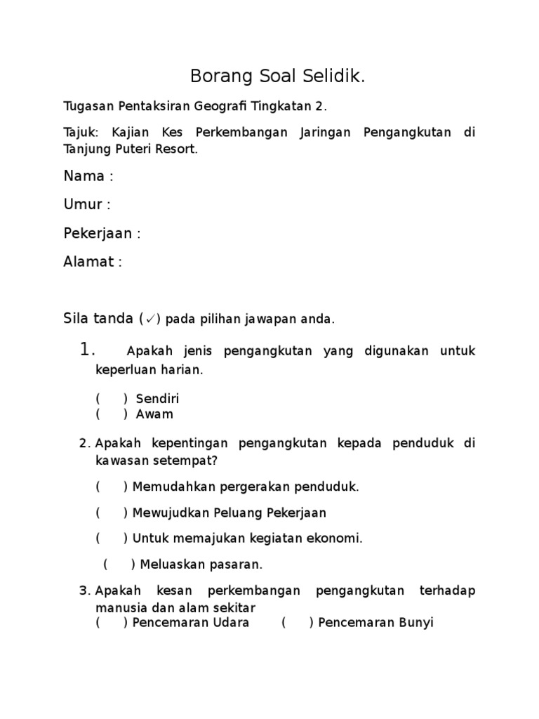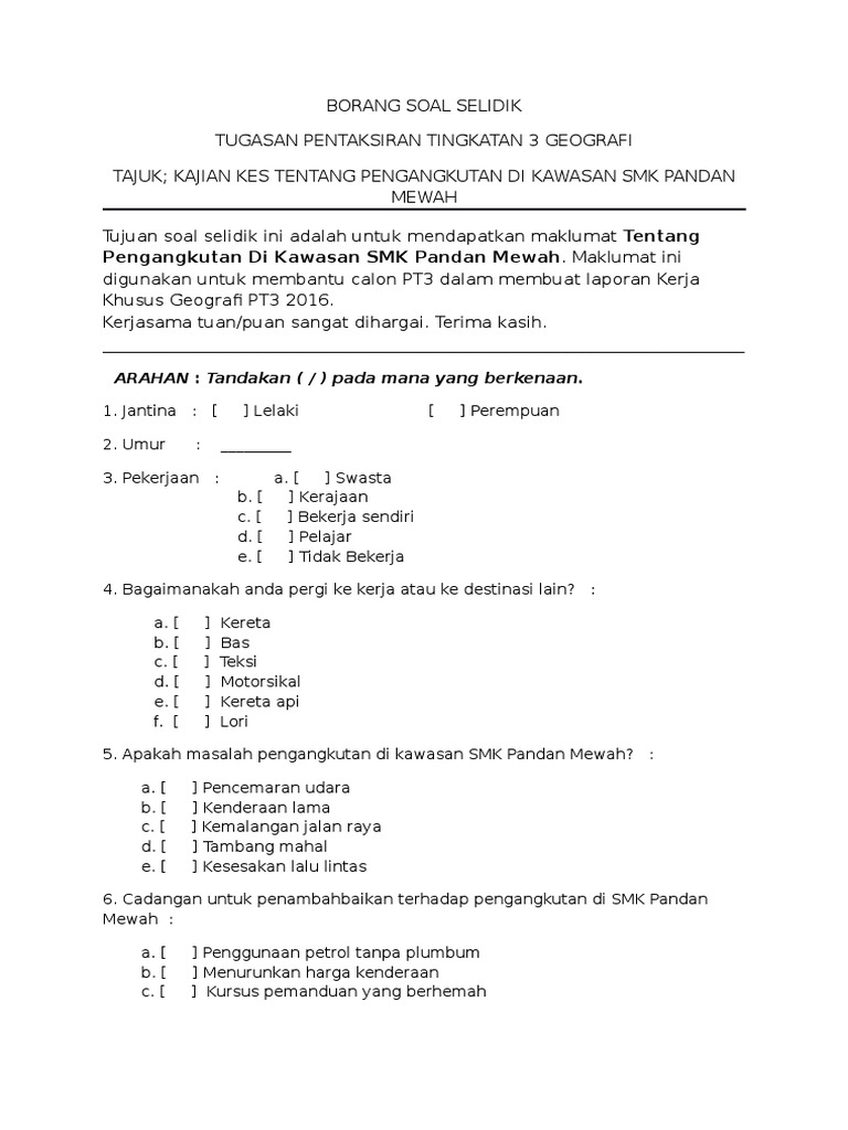 Borang Soal Selidik Pt3 Geografi Pengangkutan Awam Cute766 from i0.wp.com Download borang soal selidik denggi. Sebagai contoh, satu soalan pada borang soal selidik mungkin boleh digunakan bagi mendapat jumlah ataupun agregat tidak rasmi dalam pemilihan pengerusi, presiden ataupun wakil kepada seusatu organisasi. Report borang soal selidik, please fill this form, we will try to respond as soon as possible. Contoh borang soal selidik geografi 2021 tingkatan 3. Tekanan kerja di kalangan kakitangan awam di ibupejabat polis kontinjen selangor * borang soal selidik ini hanyalah untuk mendapatkan pandangan dan maklum balas yang akan digunakan. Tajuk kajian guna tanah di kawasan kajian anda telah dipilih dan borang soal selidik geografi pt3 2019 telah pun dipilih. Kesesakan jalan raya di hadapan smk jerantut pada waktu. Contoh borang soal selidik kerja kursus bahasa melayu (stpm)full description.