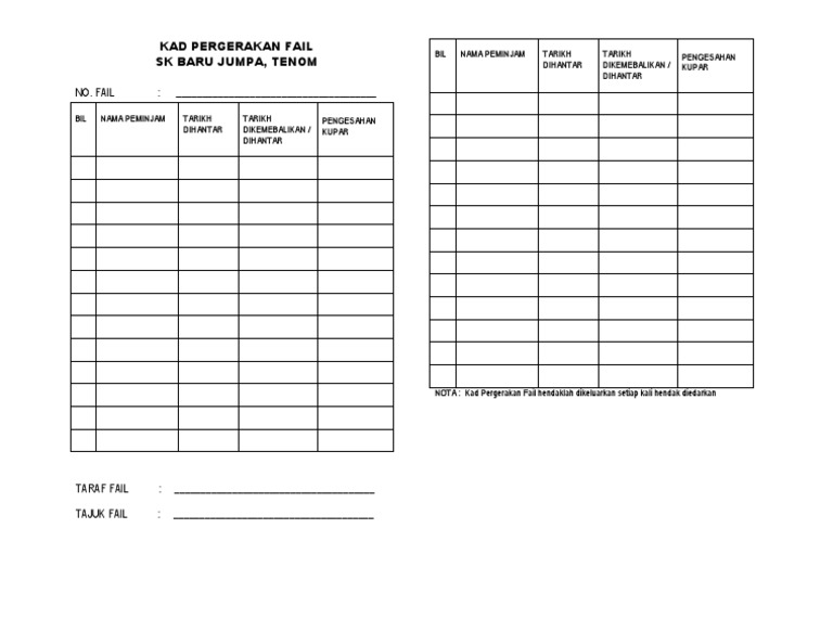 Kad Pergerakan Fai1 2 from imgv2-2-f.scribdassets.com Draf klasifikasi fail dalam format pengharmonian hendaklah dikemukakan kepada anm untuk pengharmonian di peringkat jawatankuasa pengharmonian klasifikasi fail anm. Download & view kad pergerakan fail as pdf for free. Muat turun latar belakang eps percuma direka oleh: Fail tidak dikemaskini dalam setiap institusi ataupun organisasi, sistem fail yang berkesan amat diperlukan. Pendahuluan latar belakang perlantikan pegawai dalam pengurusan fail kitaran hayat pengurusan fail 1.1 pendaftaran 1.2 pembukaan 1.3 penawanan 1.4 penyimpanan 1.5 pergerakan 1.6 penutupan 1.7 pelupusan penghantaran surat pelan. Sebagai tambahan kepada imej format png, anda juga boleh mencari watak, memancing, pergerakan, vektor, fail psd dan imej latar belakang hd. 15 kad pergerakan fail ditebuk di penjuru atas sebelah kiri. 1.4.6 kad keluar fail / kad pergerakan fail.