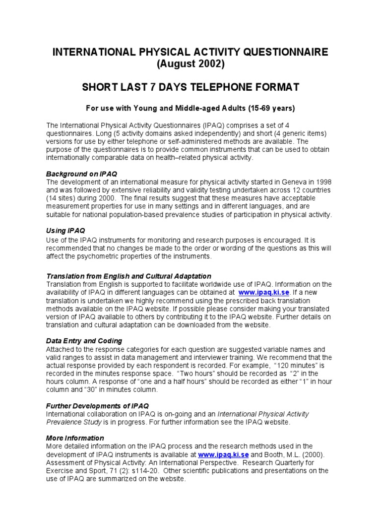 (PDF) Reliability and validity of the International ... from i1.rgstatic.net April 2004 introduction this document provides an revision to the outline for scoring the short form of the international physical activity questionnaire (ipaq). The international physical activity questionnaires (ipaq) comprises a set of 4 questionnaires. • activity at work • travel to and from places There are two versions of the questionnaire. The international physical activity questionnaires (ipaq) comprises a set of 4 questionnaires. Protocol for short form 6. Scores 'international physical activity questionnaire (ipaq)' short form. 3 craig cl,marshall a , sjostrom m et al.