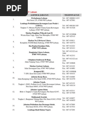 Surat 157, 87008 wp labuan pengarah lembaga pertubuhan peladang km 5,jalan pohon batu, kg pantai peti surat 81095 87020 wp labuan pengarah jabatan tenaga kerja lot 6b2,tingkat 6, blok 4 kompleks ujana kewangan 87008 wp labuan pengarah jabatan perkhidmatan penerangan unit.